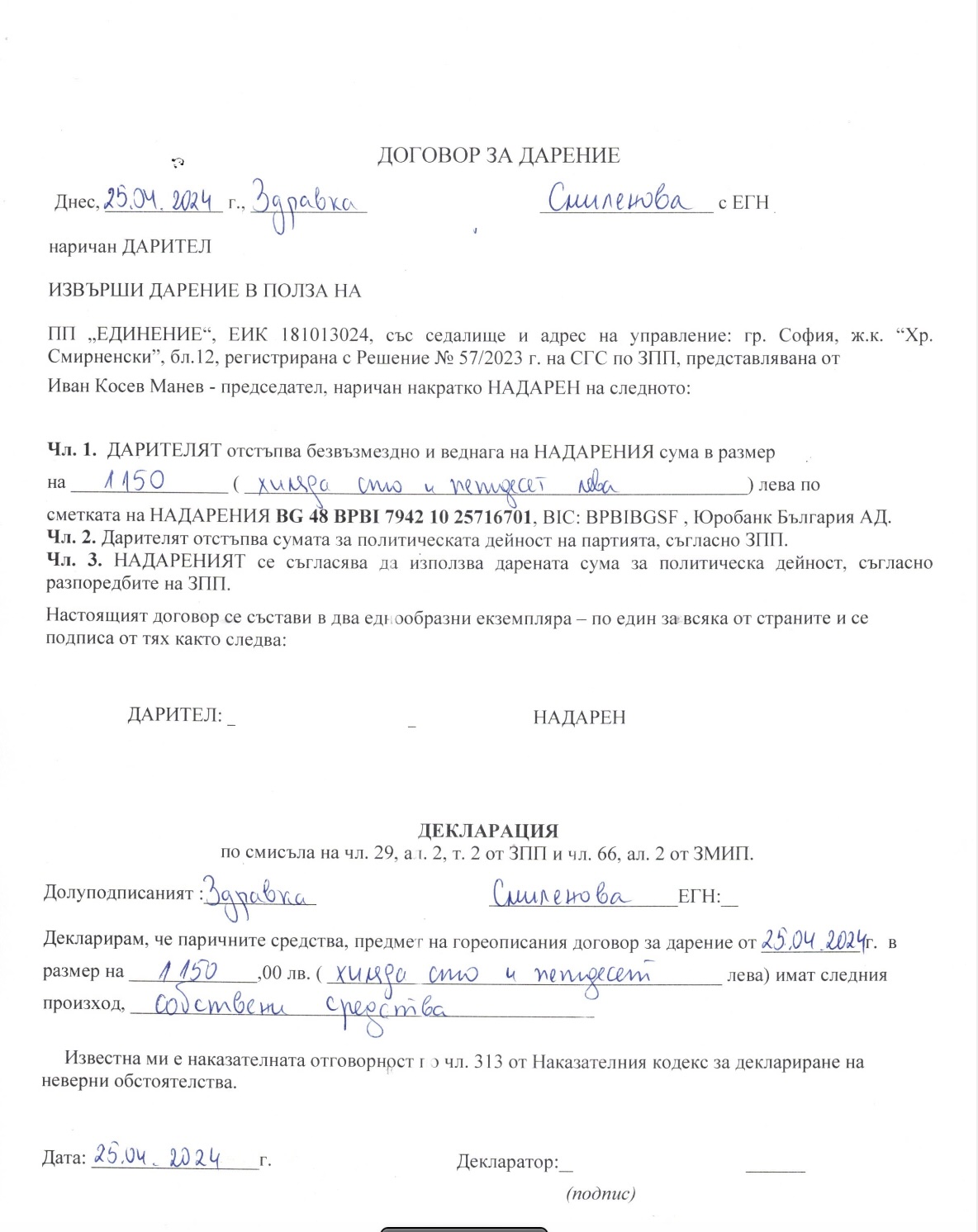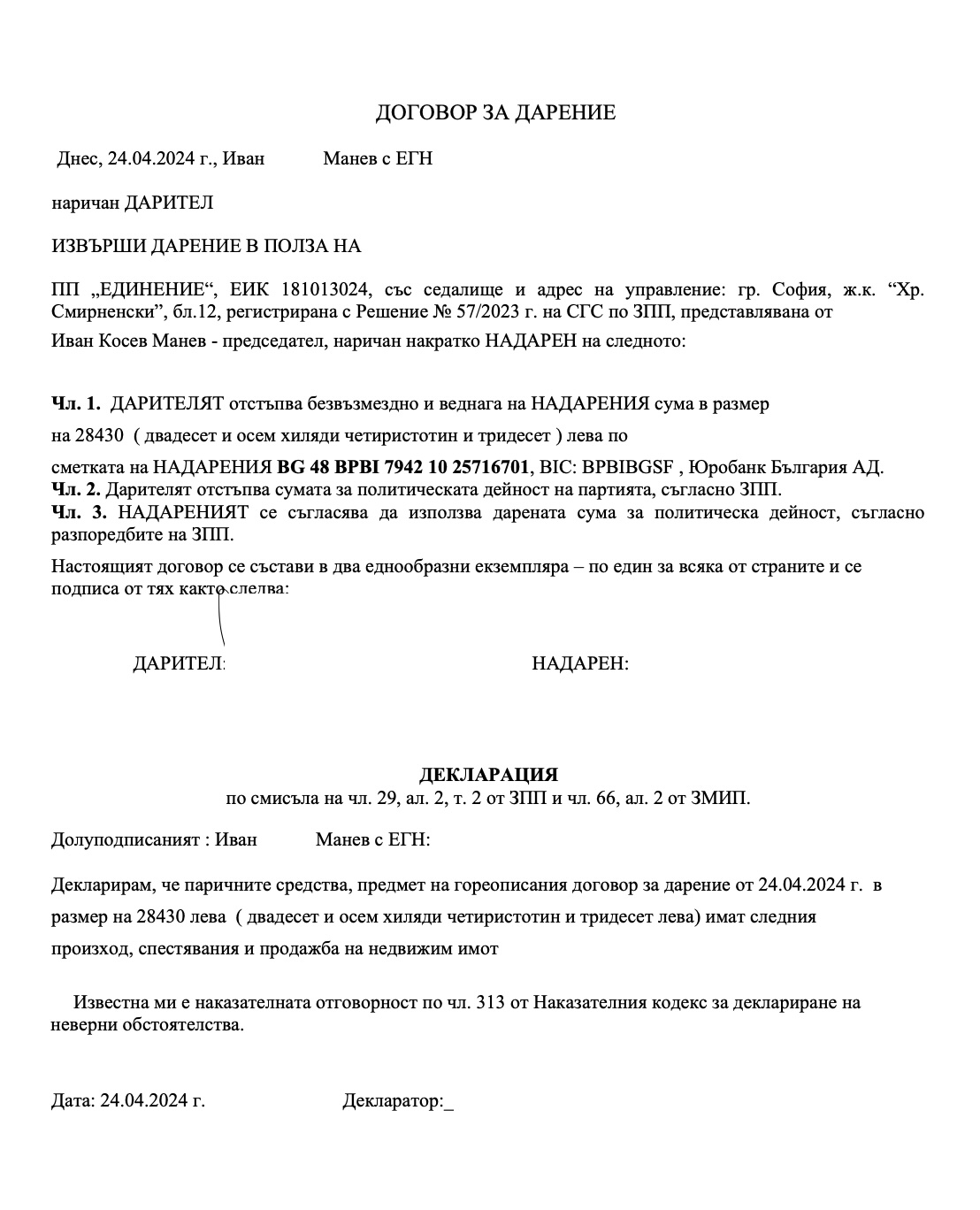 ИВАН КОСЕВ МАНЕВ | 1500 | Дарение без условие | 11.06.2024 | |