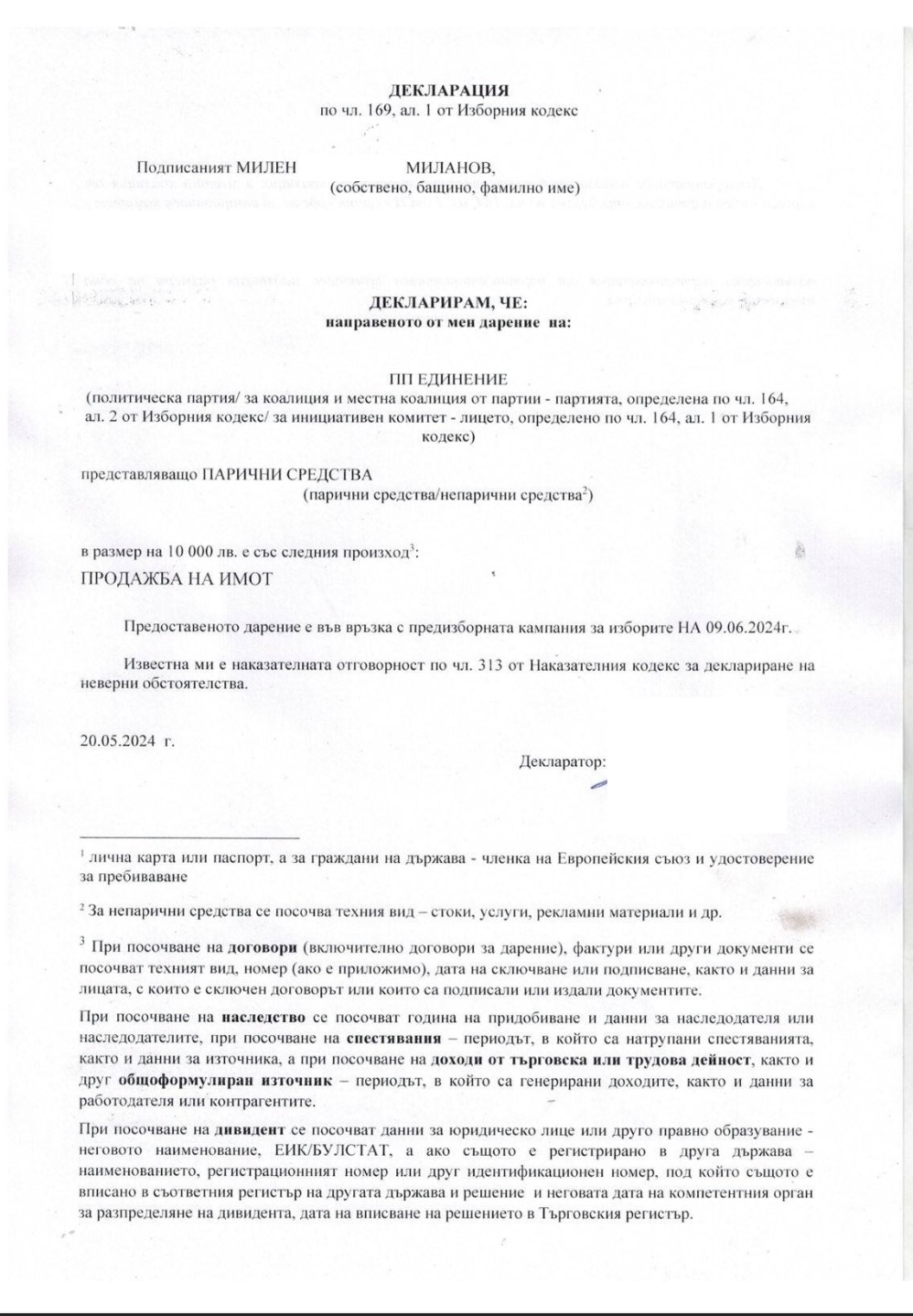 МИЛЕН МЕТОДИЕВ МИЛАНОВ | 10000 | Дарениеза политическа дейност | 13.05.2024 |  |